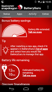 Snapdragon™ BatteryGuru is a battery life saver app that extends battery performance and improves overall user experience by intelligently making changes that optimize device functionality in phones with Snapdragon mobile processors. This app: